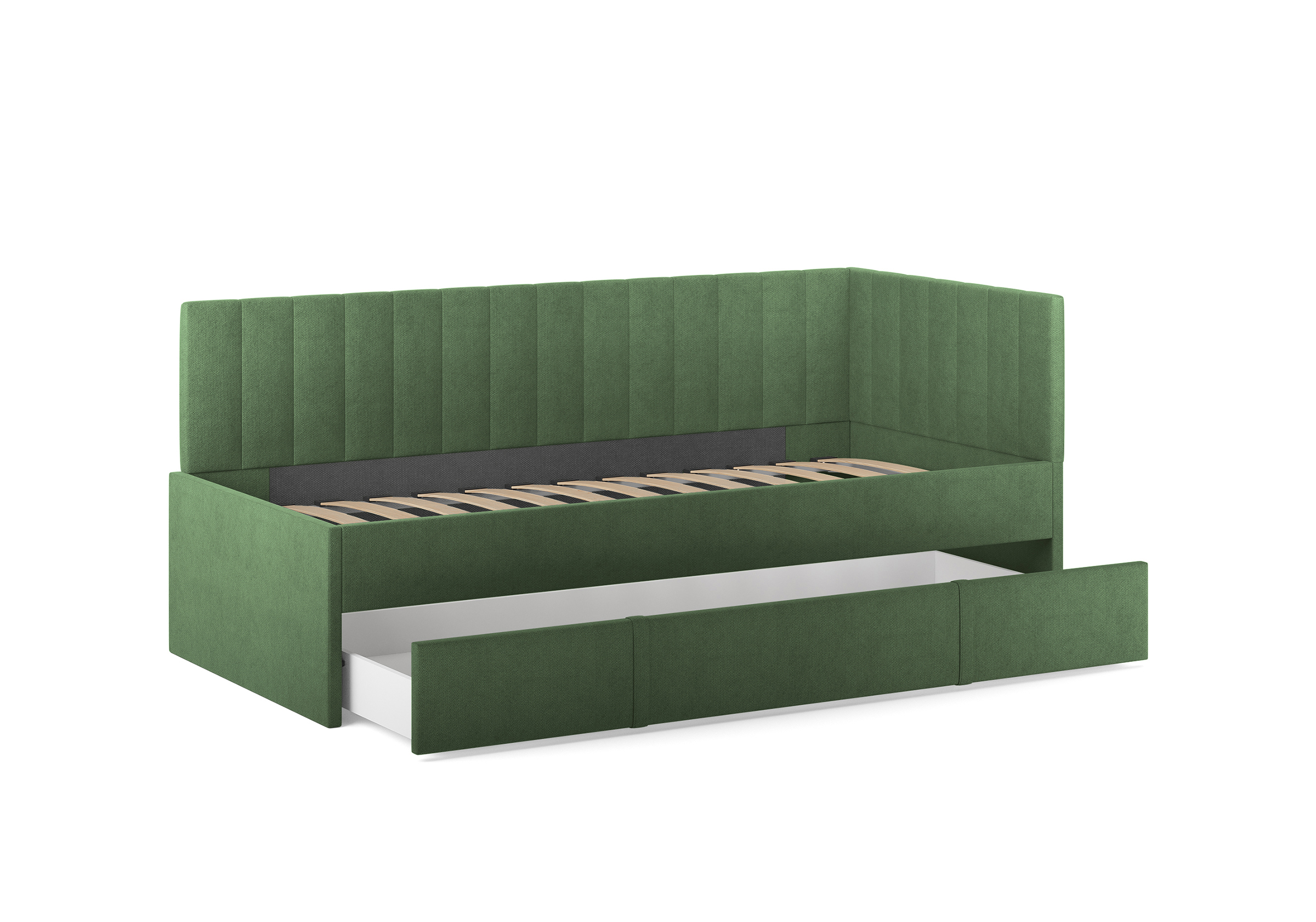 Модуль можно использовать как дополнительное спальное место или вместительный бельевой ящик. Выдвигается полностью для обеспечения уборки под кроватью.